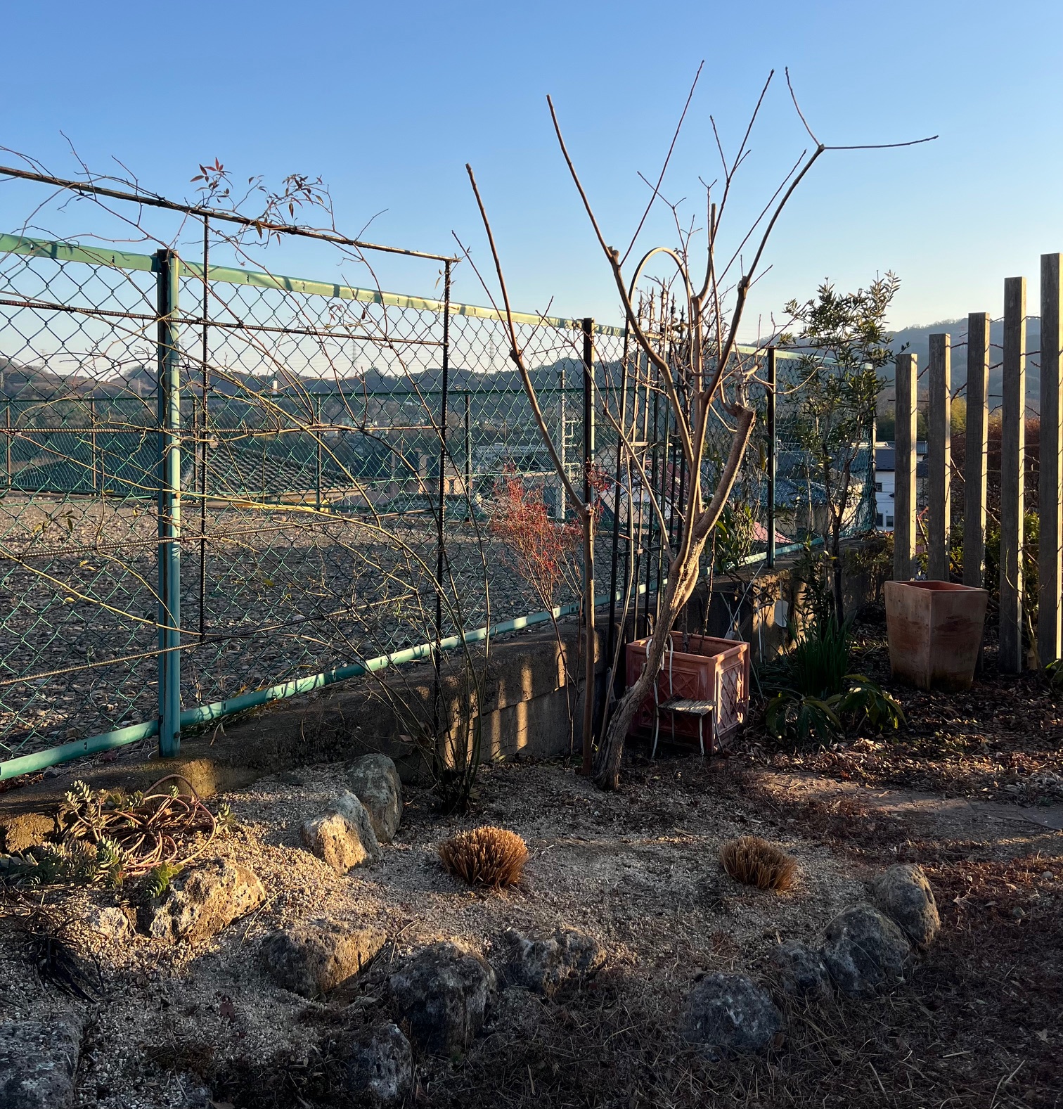 冬の刈り込み作業中、枯れ草の中から鮮やかな赤色が。